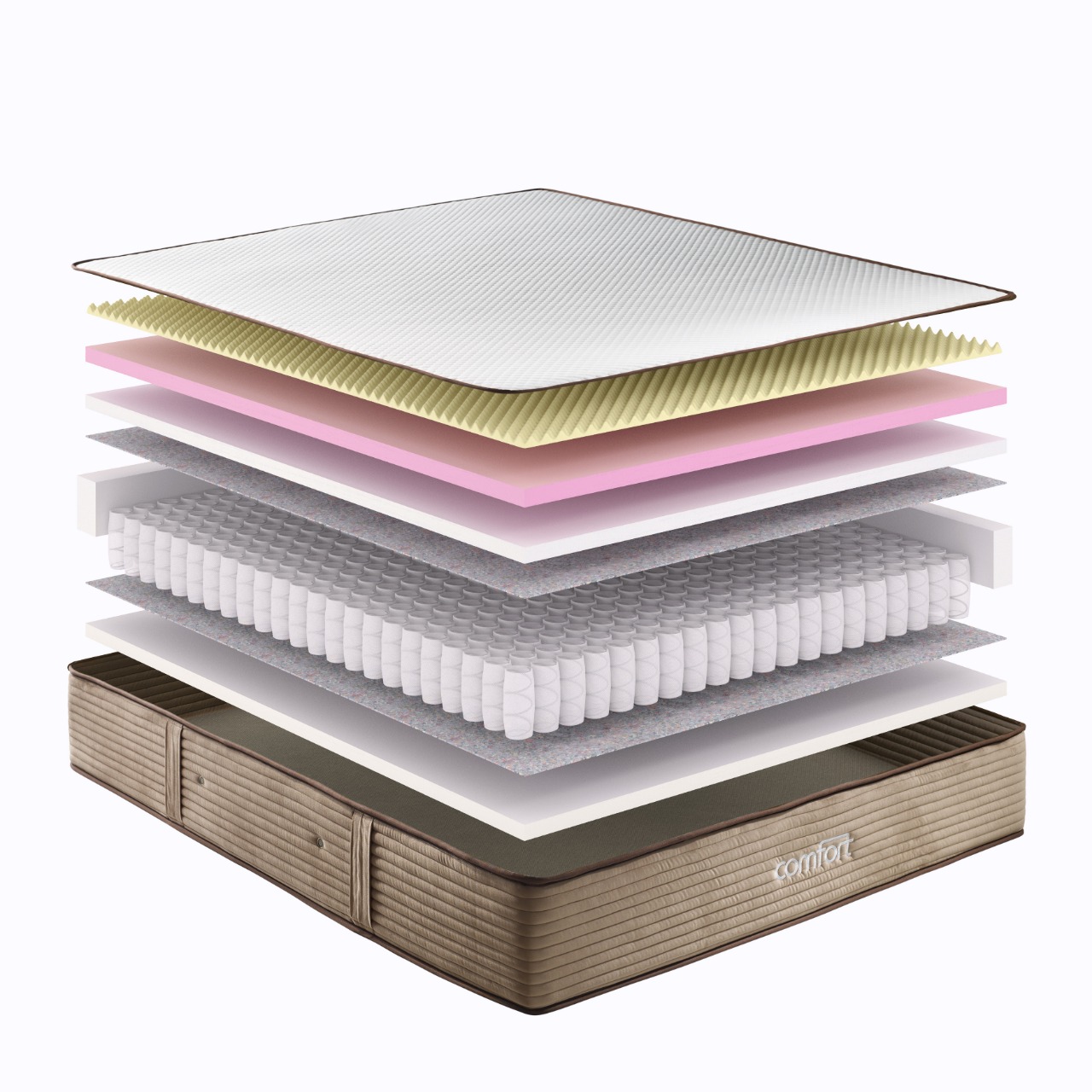 “4.14 Colchão misto. Colchão devidamente revestido, constituído de chapa dura (de madeira maciça, compensado ou outros materiais com funções similares) ou por camada(s) com materiais distintos da espuma de poliuretano (como látex, elementos magnéticos, massageadores, rabatan, infravermelho, entre outros), sobreposto por lâminas de espuma em uma ou ambas as faces e nas laterais.”