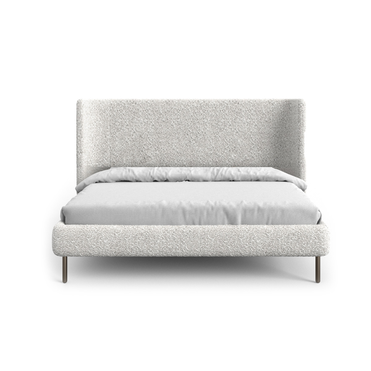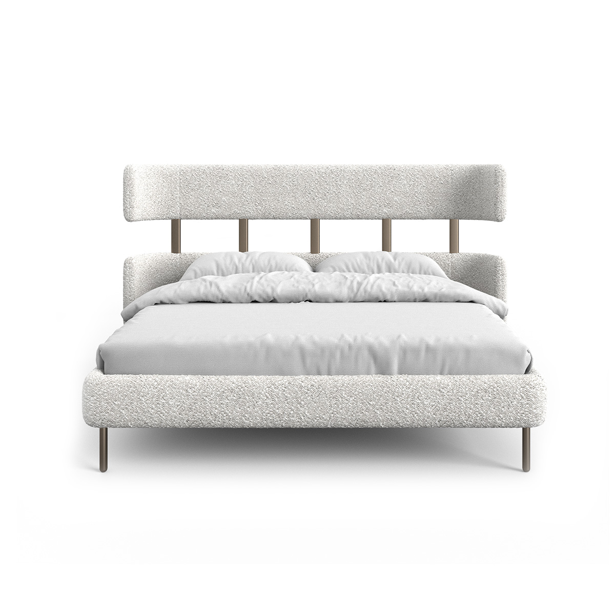 • Cabeceira estruturada com duas chapas anatômicas curvas de madeira e revestida com espuma de poliuretano e conectadas por hastes de aço carbono pintadas em forma de grade. A cama é construída com bases revestidas e estrado de madeira para proporcionar perfeita ventilação ao colchão.
