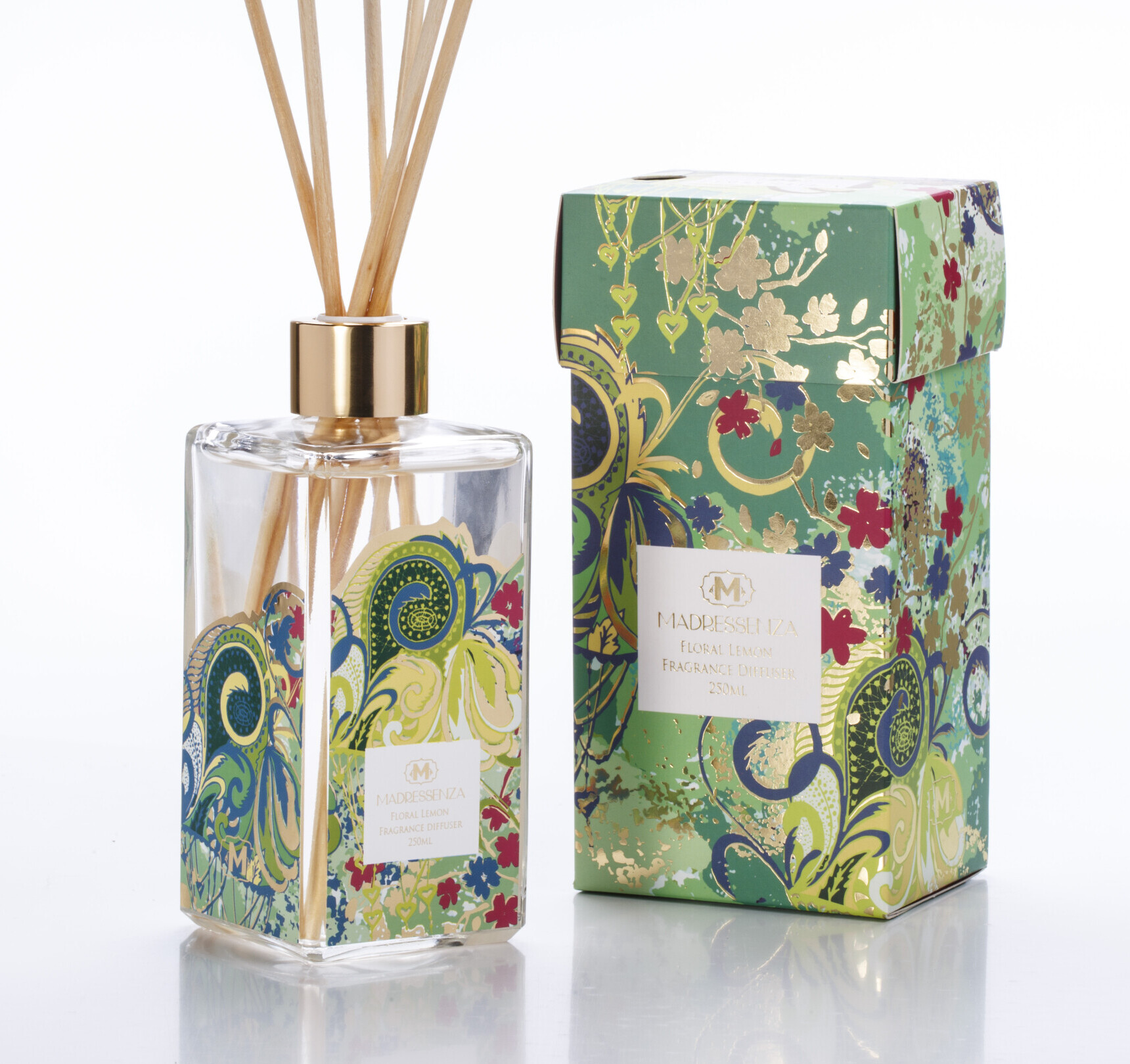 Concebido com o propósito de perfumar e personalizar os ambientes mais requintados, onde a fragrância se espalha harmoniosamente envolvendo o espaço. Embalado em um belo frasco de vidro decorado e com válvula dourada, acompanha uma caixa com belíssima ilustração desenhada a mão e 1 conjunto de 6 varetas, adicionando assim elegância a qualquer ambiente.