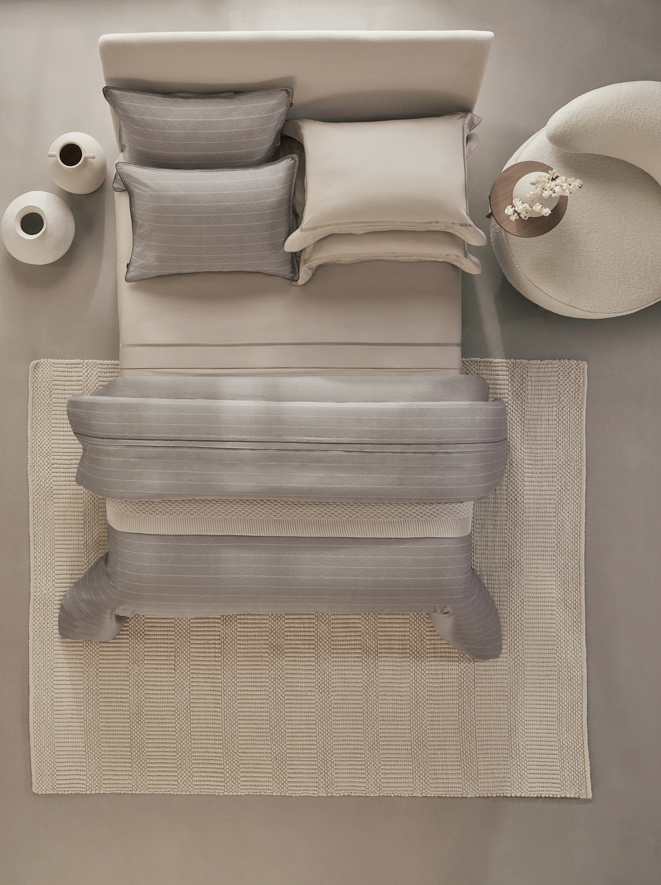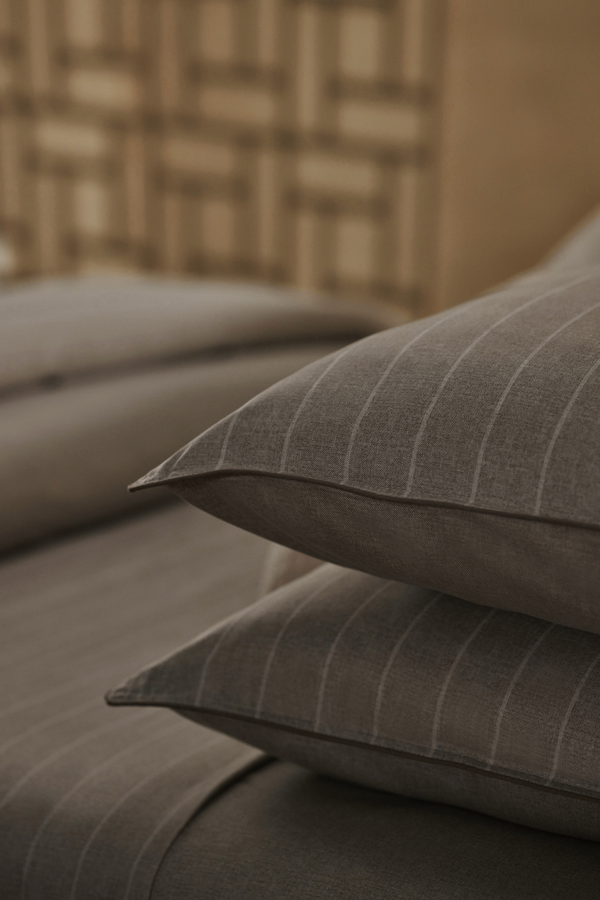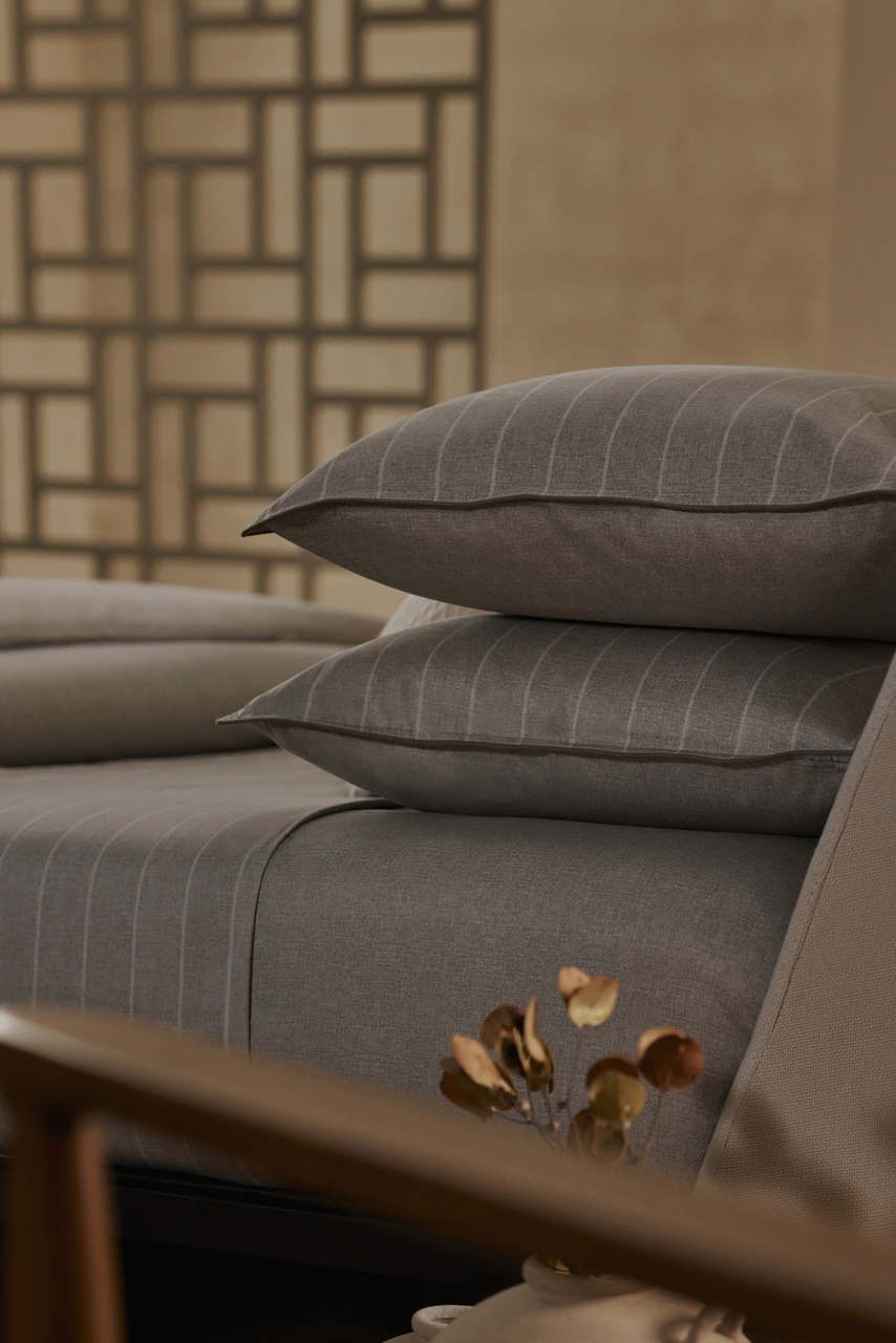 Coleção The Garment 300 Fios By The Bed em 100% Algodão Egípcio. Sua estampa nobre que remete ao linho com delicadas riscas de giz resgata uma moda clássica e atemporal capaz de valorizar ambientes de qualquer estilo.